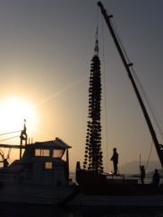 | いかだから垂下ろされた牡蠣は、養殖環境を変えると成長や身入りが良くなる特徴があるため、収穫までに何度も船でいかだを引いて移動させています。 |